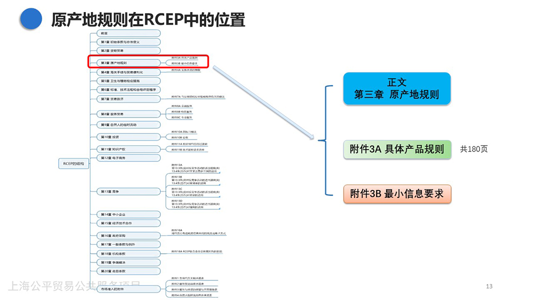 - 本讲分为上下两集,概览了RCEP项下原产地规则的基本结构,详解了其中的原产地判断标准及其补充规则、直运规则以及程序性规则,在与其他FTA的比较后提炼了RCEP原产地规则的亮点,并且结合关税减让承诺分析了RCEP对集成电路、调味香料、化妆品等产品的影响。