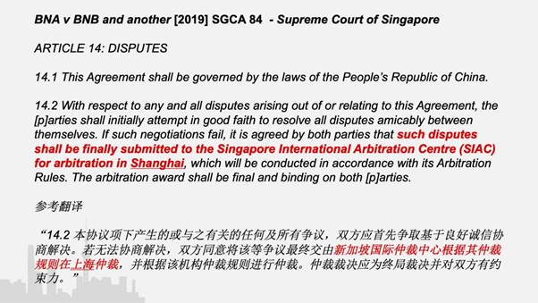 - BNA v BNB and another [2019] SGCA 84案从2016年开始,历经新加坡仲裁庭、新加坡高等法院、新加坡最高院上诉庭以及上海市第一中级人民法院前后长达四年的审理,主要是为了确定该合同中的仲裁协议是否有效。