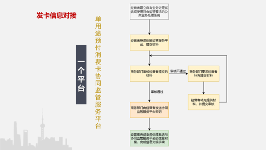 - 相对于《商务部规定》,《上海市规定》则对发行单用途预付卡所应履行的备案手续进行了完善,主要体现在上海市已建立全市统一的单用途预付消费卡协同监管服务平台(以下简称为“协同监管服务平台“),经营者可以通过在协同监管平台上提交材料,并将自身的发卡业务处理系统与监管平台进行技术对接,以完成信息对接流程。