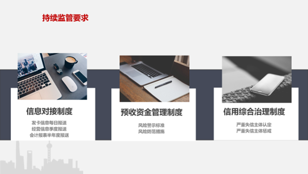 - 需要提醒的是,经营者完成发卡信息对接手续并非就万事大吉了,商务主管部门对单用途预付卡的监管是一个持续的过程,具体体现在以下三项制度: