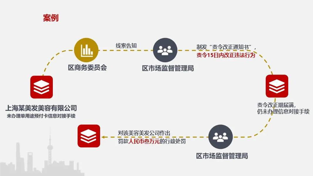 - 某区市场监督管理局通过区商务委员会线索告知,得知上海某美发美容有限公司存在单用途预付卡发行情况,但未与市单用途预付消费卡协同监管服务平台对接并报送相关信息。某区市场监督管理局依法向该公司制发“责令改正通知书”,责令其15日内改正违法行为。责令改正期届满后,该公司依然未与市单用途预付消费卡协同监管服务平台对接。2020年4月,区市场监督管理局依法对其作出罚款人民币叁万元的行政处罚。